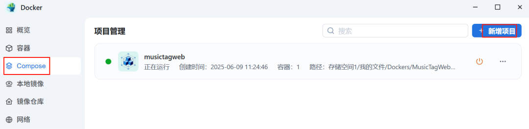 - 在飞牛主页面找到 Docker 打开后,切换菜单 Compose -> 新增项目