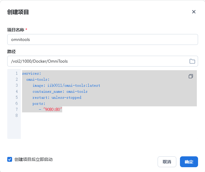- 在创建项目页面根据实际情况定义 项目名称、选择 路径,选中 创建 docker-compose.yml 后,把下面 yml 文件粘贴到文本框中。检查无误后点击 确定 按钮进行部署